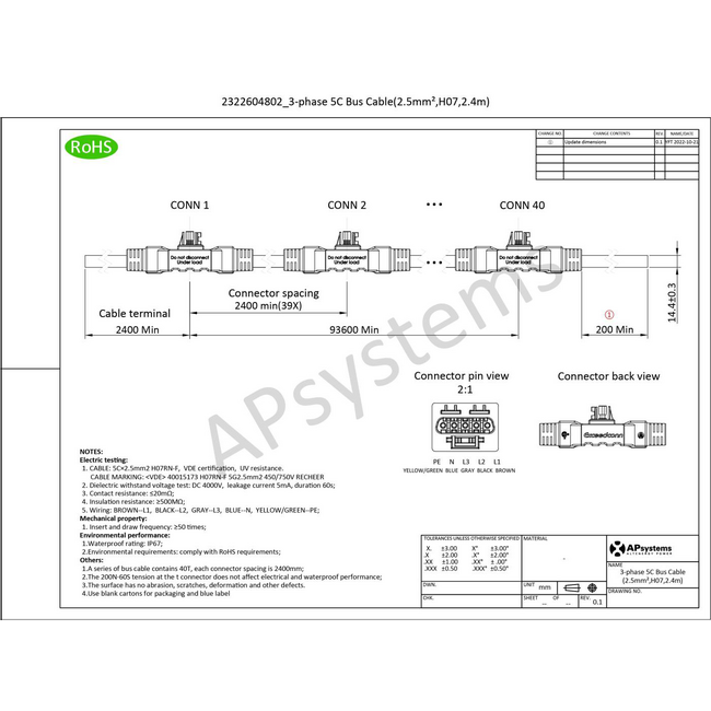 Il cavo bus CA 5C di APSystems è utilizzato per collegare l'uscita CA del microinverter alla rete elettrica. Il cavo APS-5C-AC-BUS-2,4 trifase è adatto solo ai microinverter QT2 di APSystems. Per ogni collegamento è necessario un APS-5C-AC-BUS-2.4 separato. La distanza tra i connettori dei microinverter QT2 è di 240 cm e il cavo a cinque conduttori ha fili da 2,5 mm2.